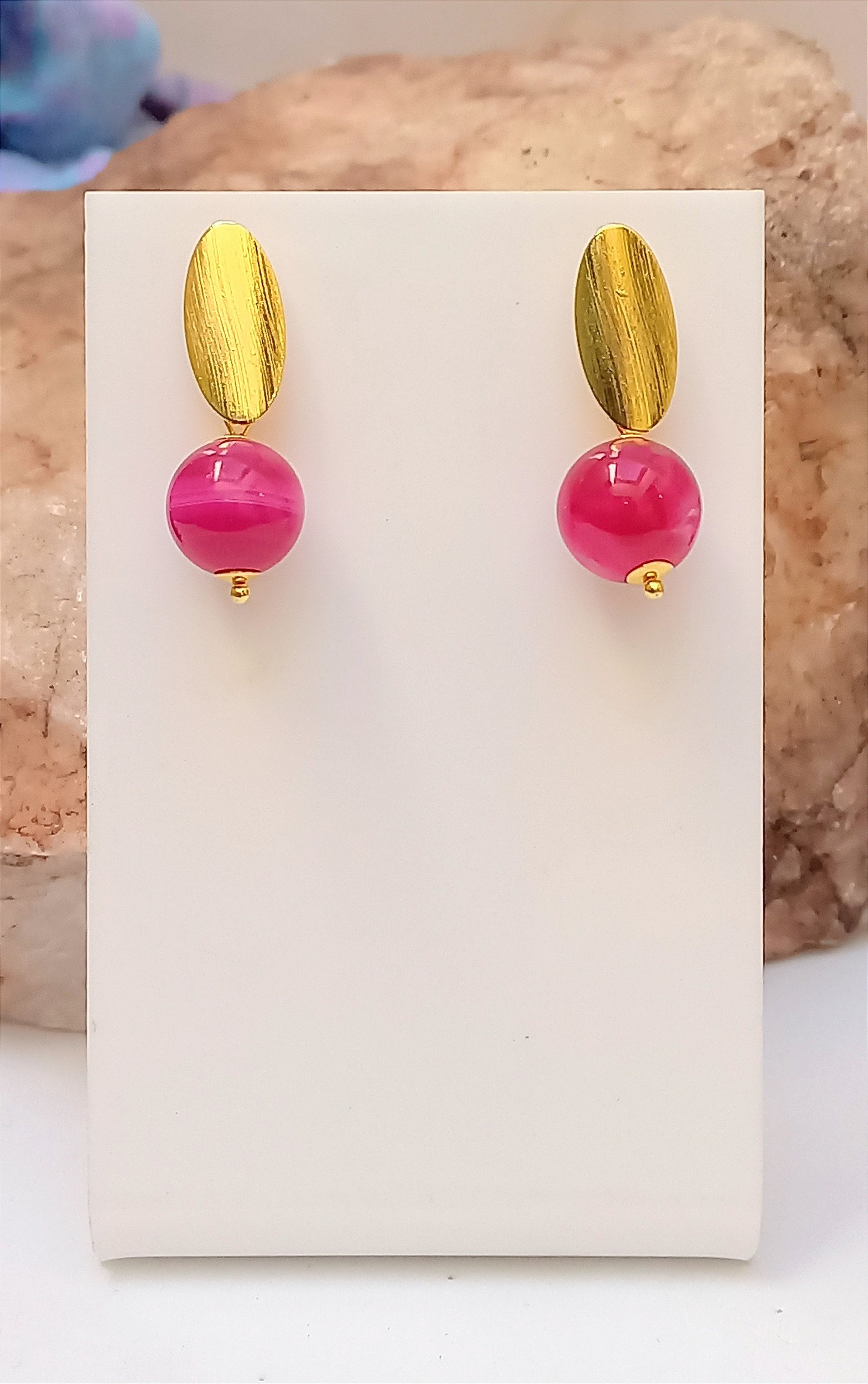 Brinco Básico Ágata Pink, uma bijouteria em banho dourado com uma esfera Rosa Pink e base lisa e delicada.