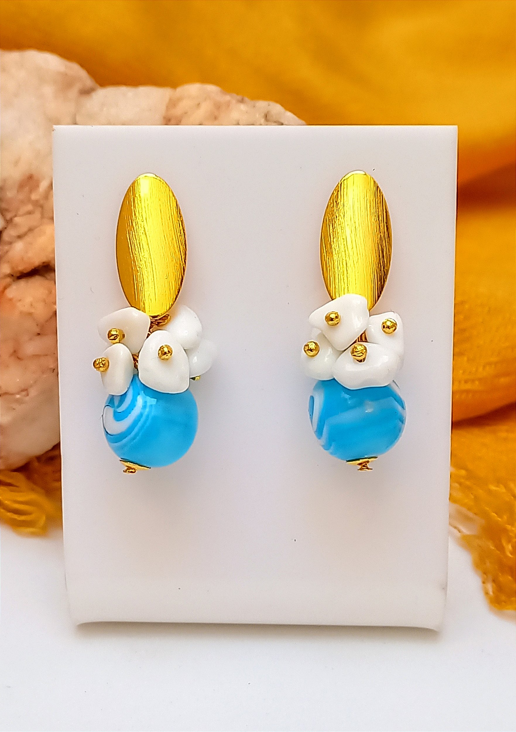 Brinco Céu e Nuvem, um acessório em bijuteria no banho dourado, com esfera mesclada em resina e cascalhos