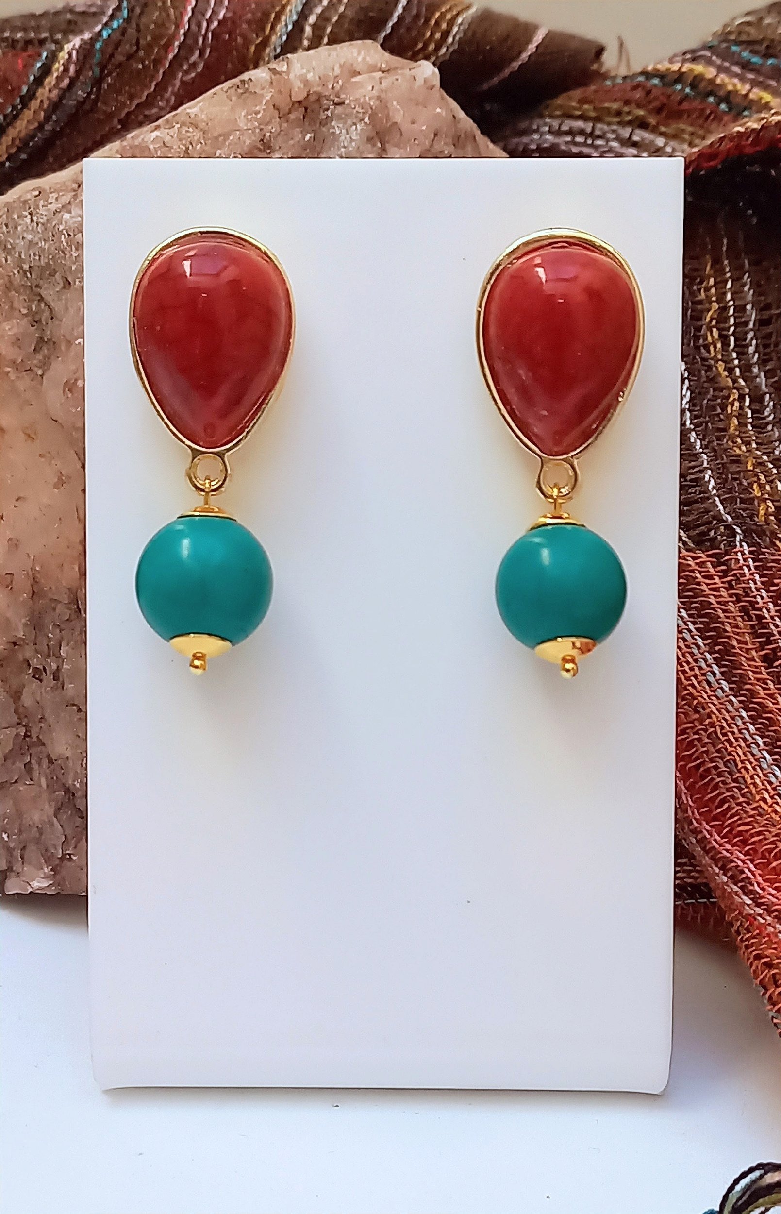 Brinco Gota Red, um acessório em bijuteria com banho dourado, base em fornato de gota com colagem vinho,