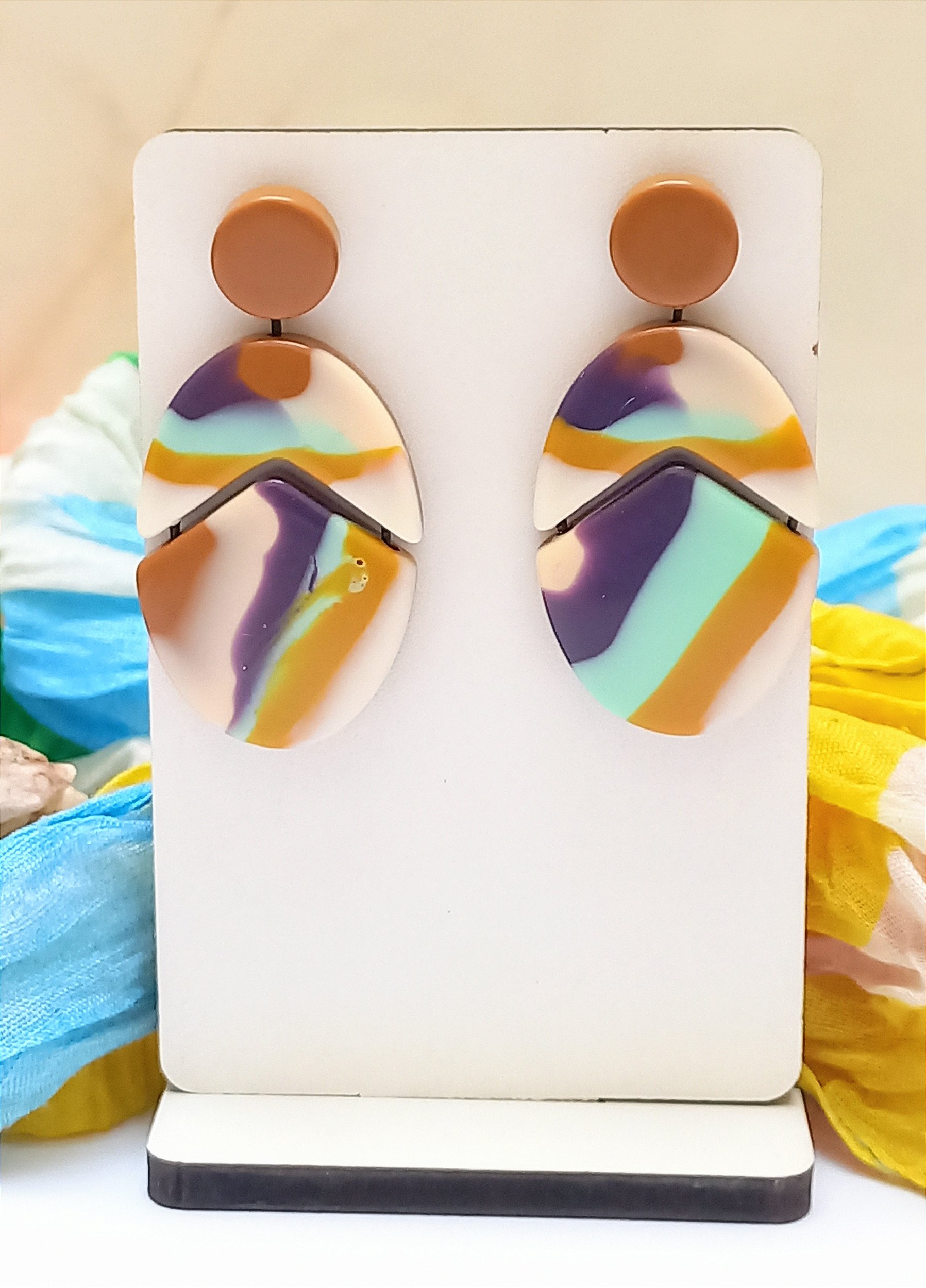 Brinco Resina Mostarda, um acessório em bijouteria, sendo uma resina muito leve, com o fundo em cor mostarda e