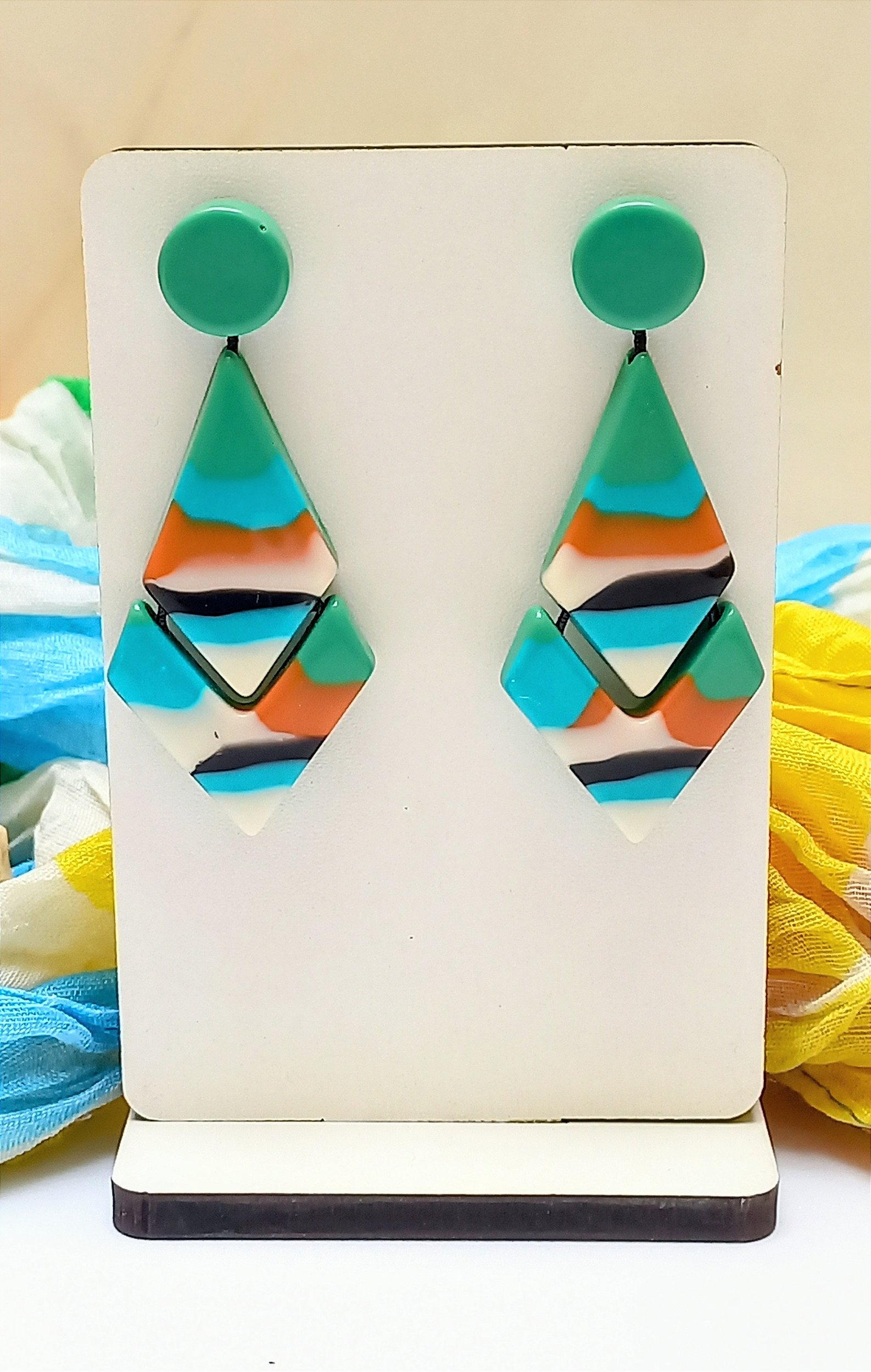 Brinco Resina Verde Cores, uma bijouteria em resina muito leve, com cores verde no fundo e colorido em sua frente,