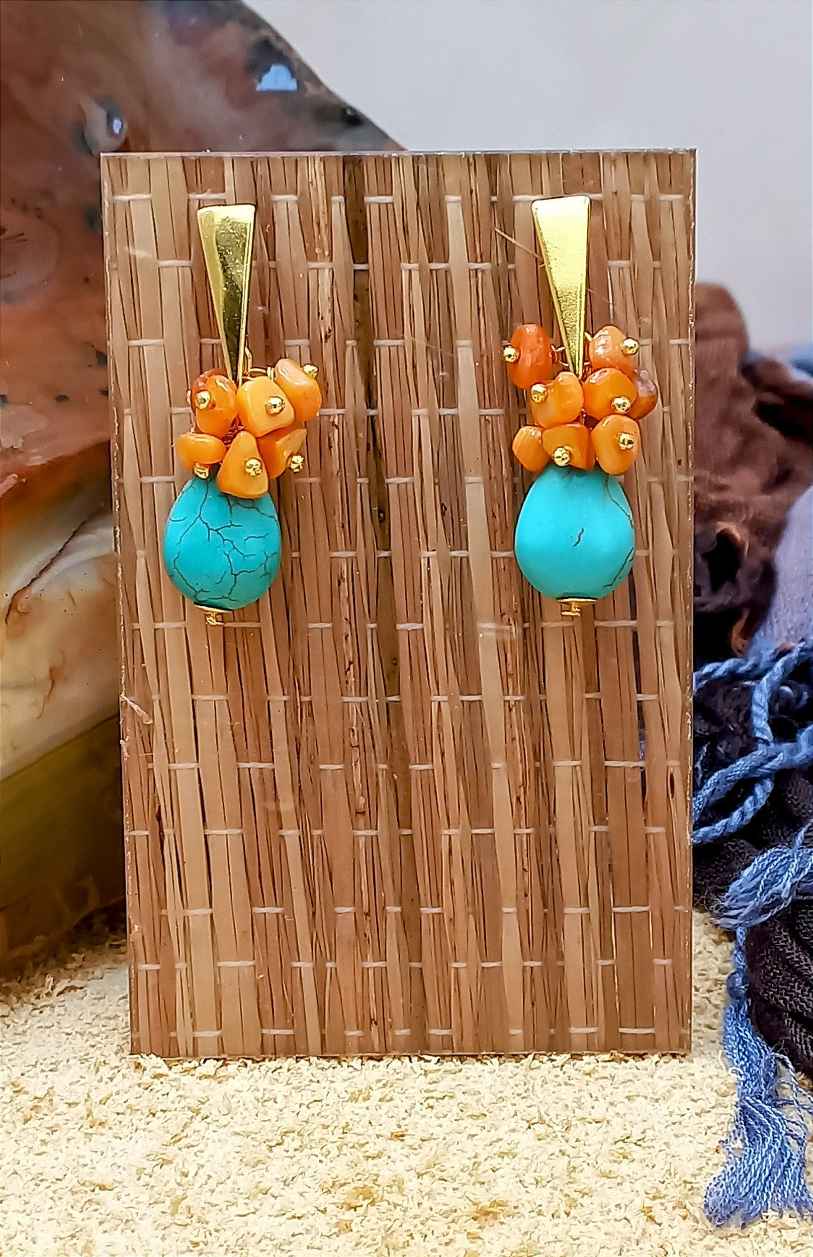 Brinco Sol Céu, uma bijuteria em dourado, muito delicada, com minis cascalhos e gota turquesa em pedra Howlita.