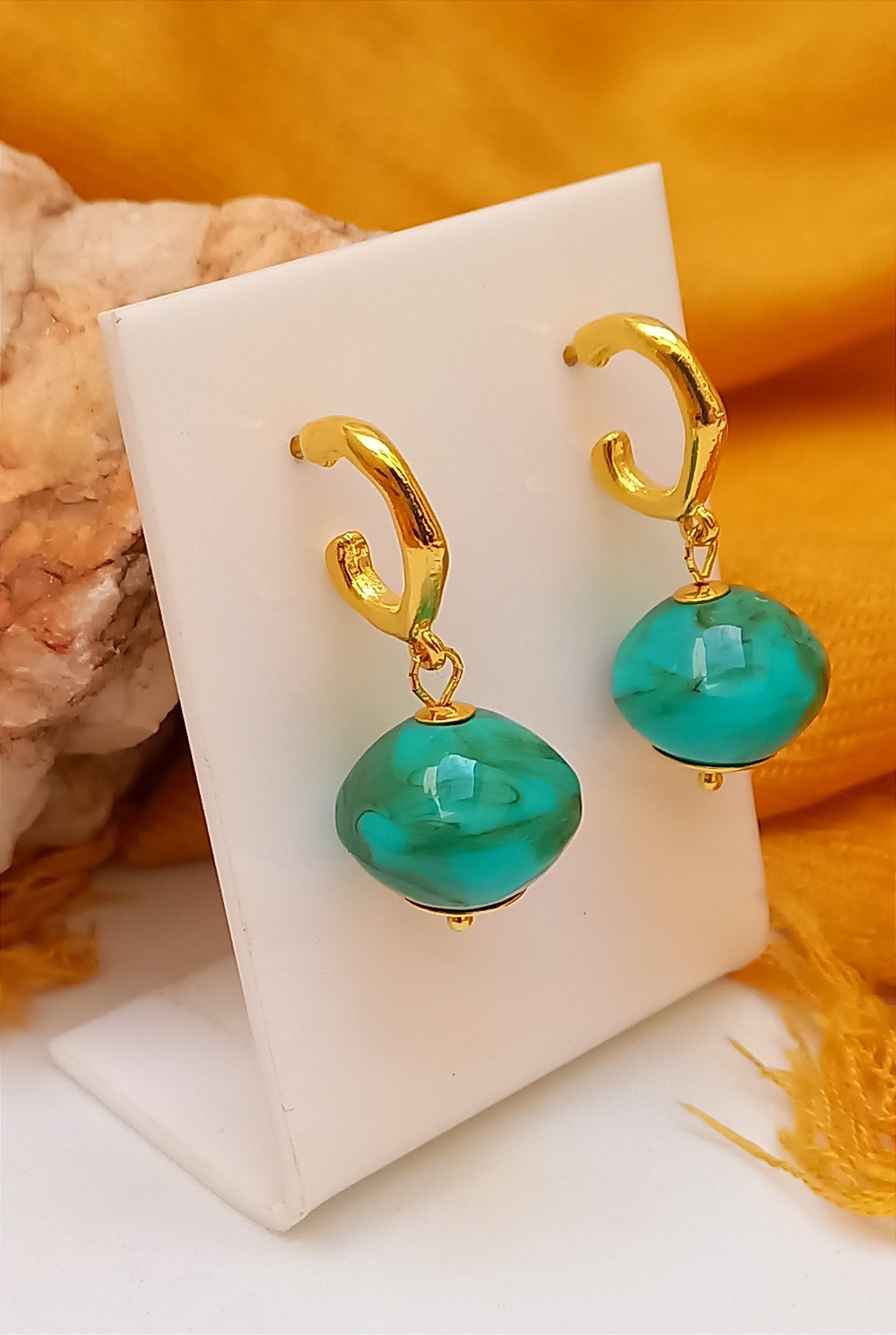 Brinco Turquesa Mesclado, acessório em bijuteria dourada, sendo uma argola pequena, com uma esfera em resina