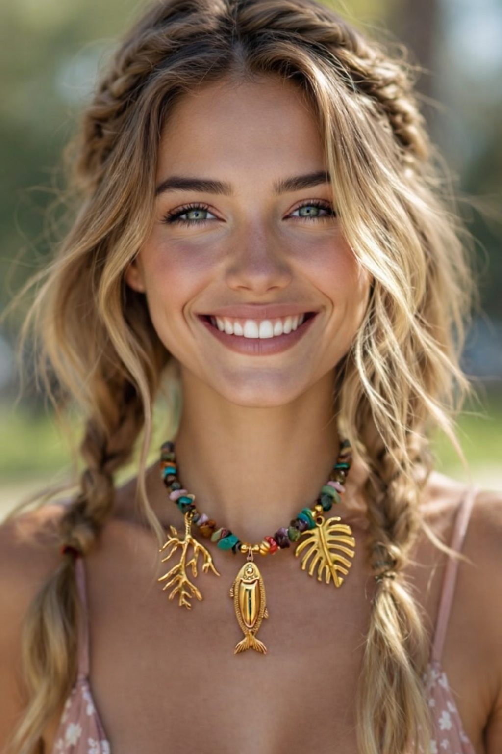 Colar Curto Cascalhos e Pingentes, um acessório em bijouteria dourado, com cascalhos coloridos, pingentes variados.