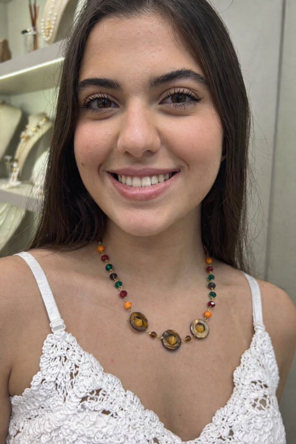 Colar Curto Cores Vivas, uma bijouteria em dourados, com elos em madreperolas, cristias coloridos,