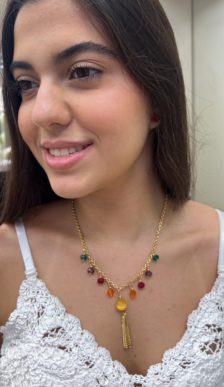 Colar Curto Fim de Tarde, um acessório em bijouteria fina, em banho dourado, com cristais coloridos e