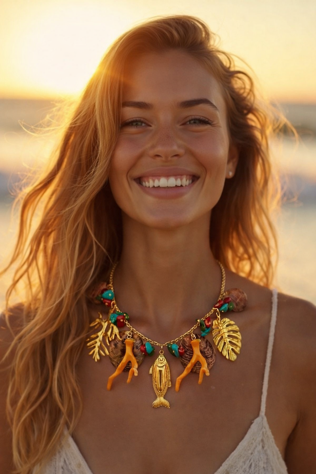 Colar Curto Mar Badulaques, um acessório em bijouteria dourado, com vários elementos, peixe, galho,