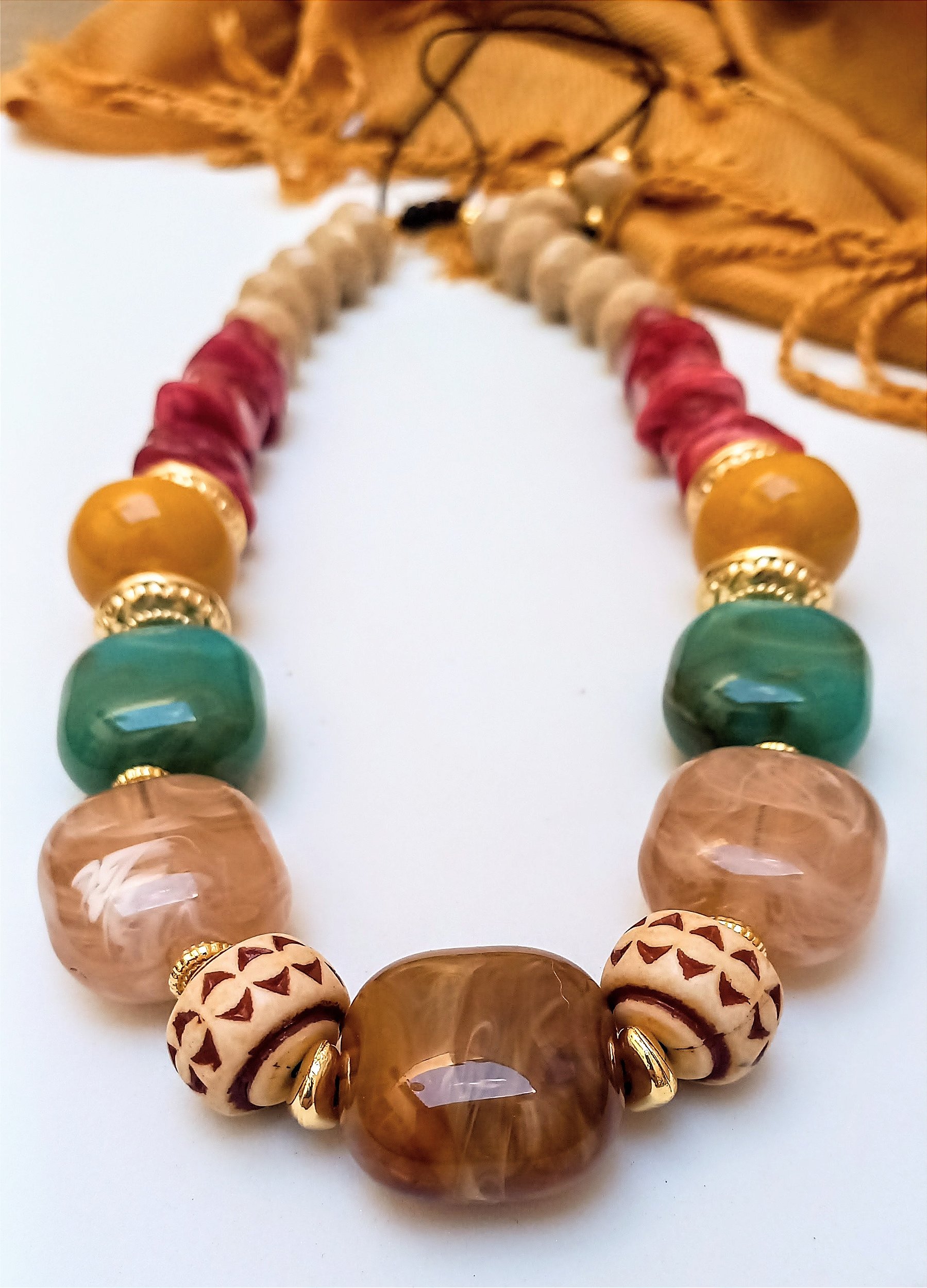 Colar Curto Resinas Terra Fértil, um acessório em bijuteria com detalhes dourados, resinas variadas em