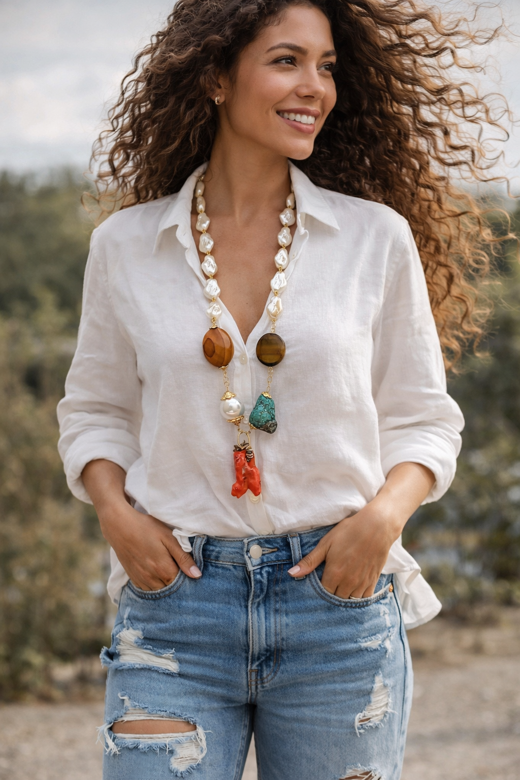 Colar Longo Boho Coral Rústico, um acessório em bijouteria em dourado, com pedras naturais como, galho de coral natural,