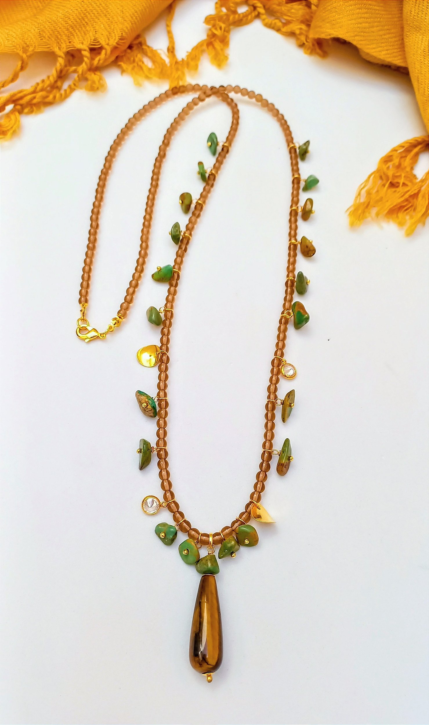 cascalhos amazonita, pontos em strass, uma gota de Olho de Tigre. Um longo bem delicado.