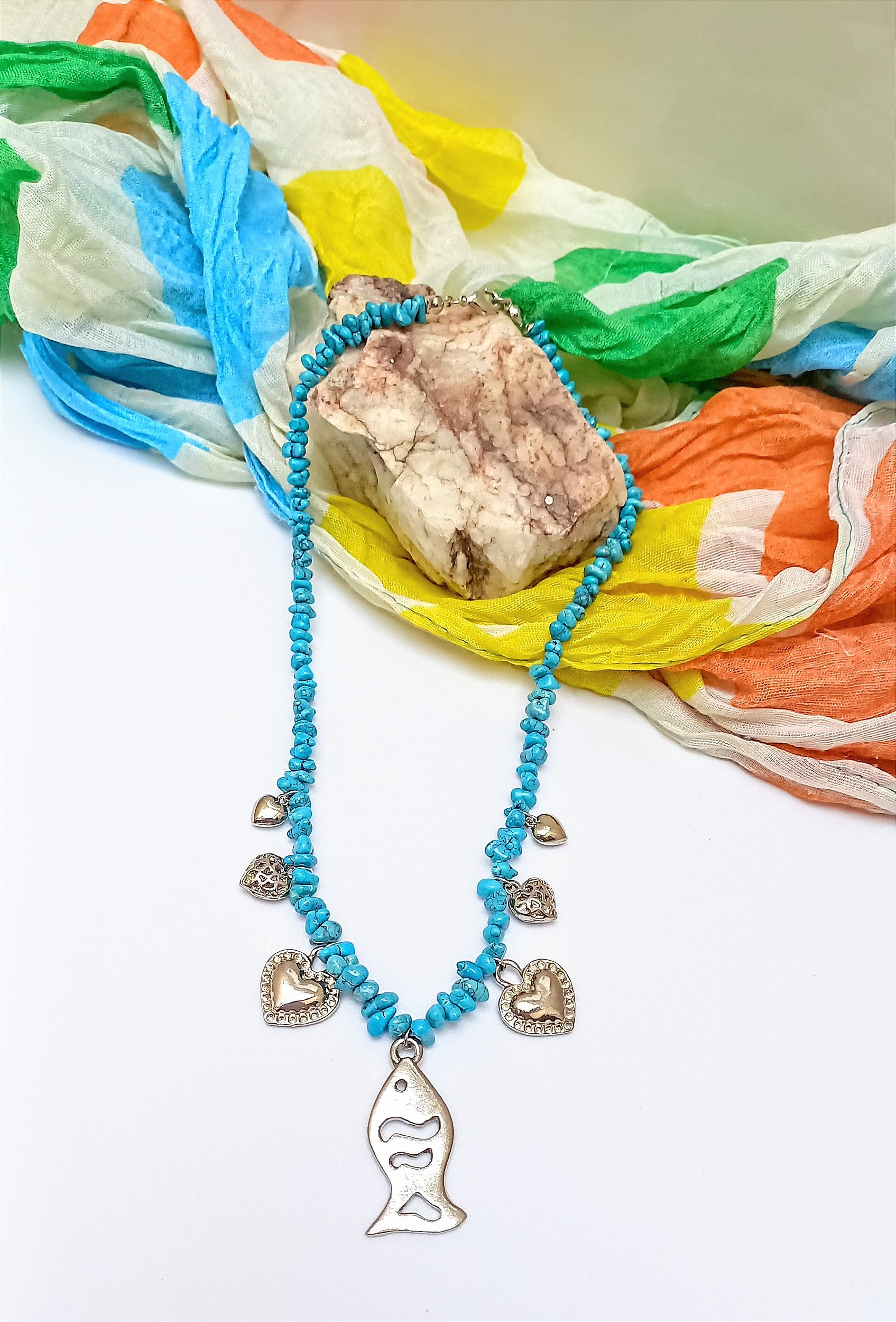 O Colar Peixe Coração com cascalho turquesa é uma peça delicada em bijuteria prata níquel que traz charme e estilo para seus looks de verão e praia. Com pingentes em formato de peixe e corações, ele combina perfeitamente com dias ensolarados e ocasiões informais, oferecendo uma alternativa leve e colorida para quem busca acessórios diferenciados. A composição com cascalhos turquesa realça o visual com uma cor vibrante que remete ao mar e à natureza.