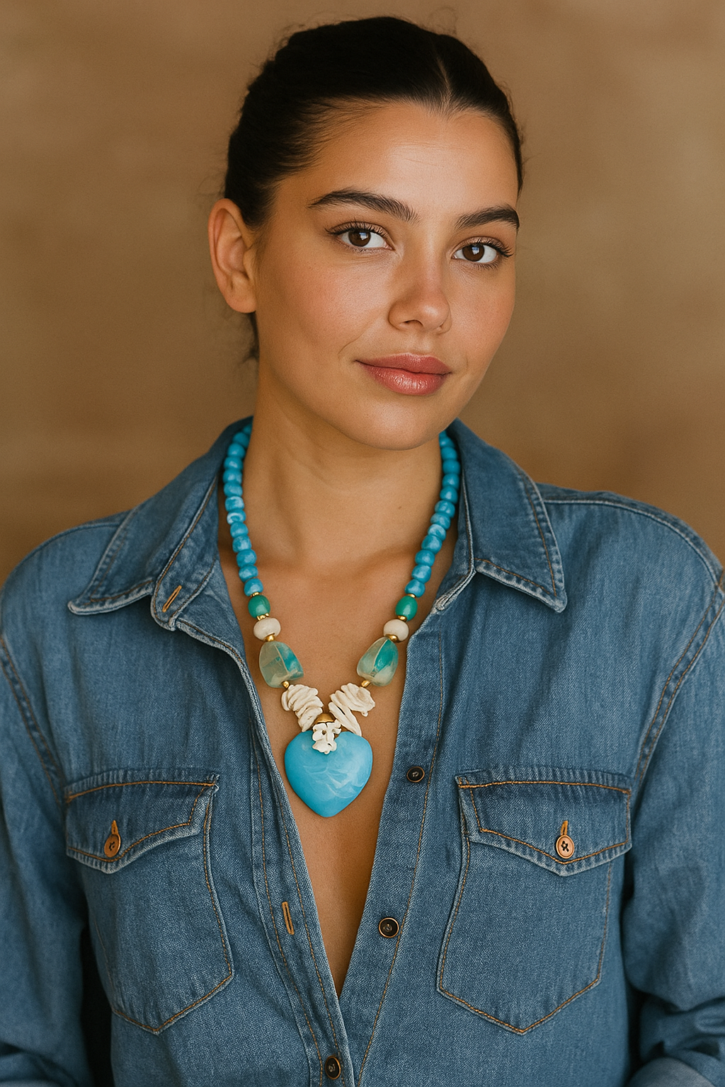 Maxi Colar Coração Azul Claro, uma bijuteria com pingente em coração grande, com lascas de madrepérolas,