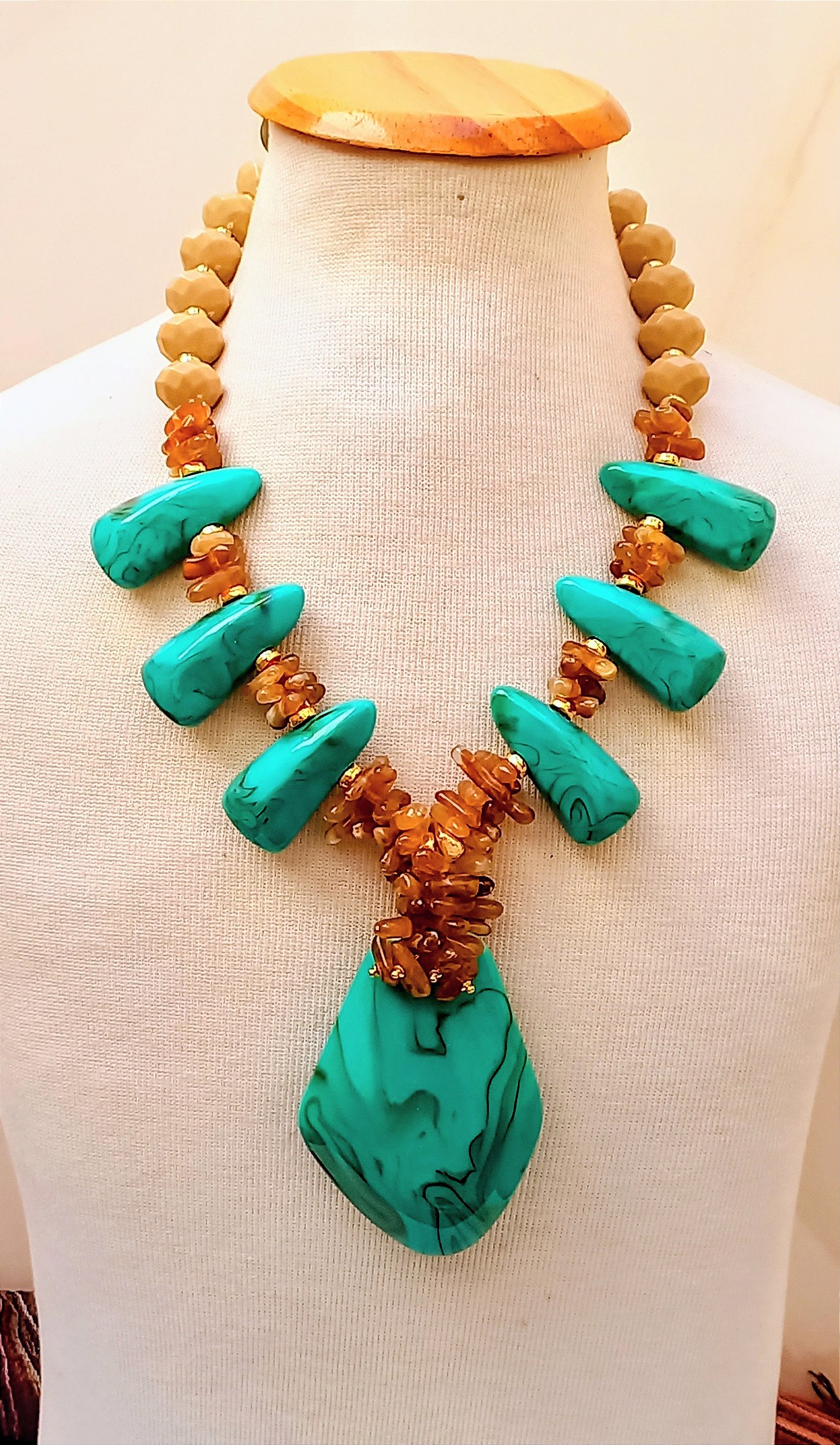 Maxi Colar Curto Turquesa e Nude, um acessório em bijuteria muito exuberante, imponente, cheio de presença.