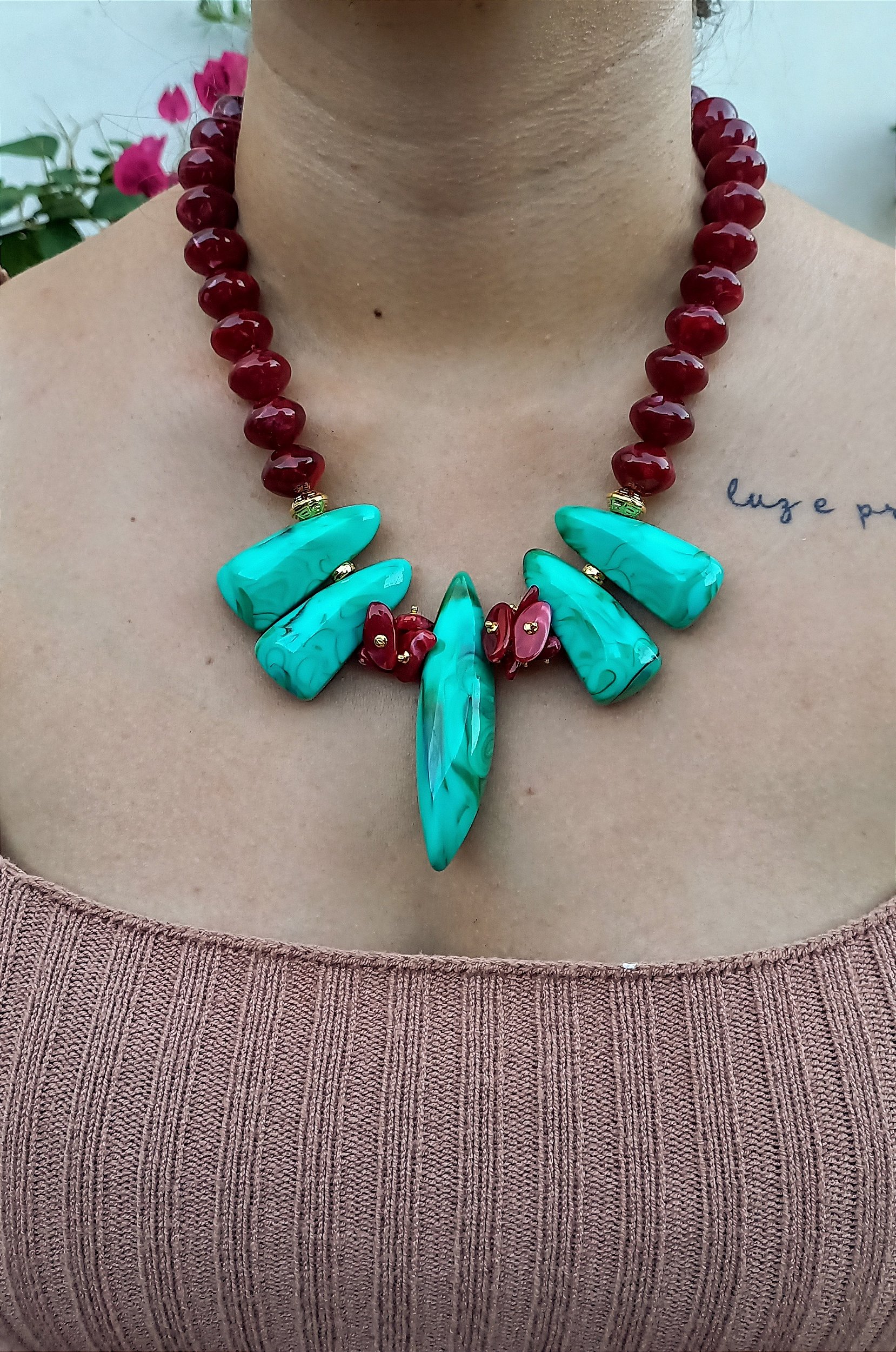 Maxi Colar Pingos e Vinho, uma acessório em bijouteria com detalhes em dourado, resinas em esferas