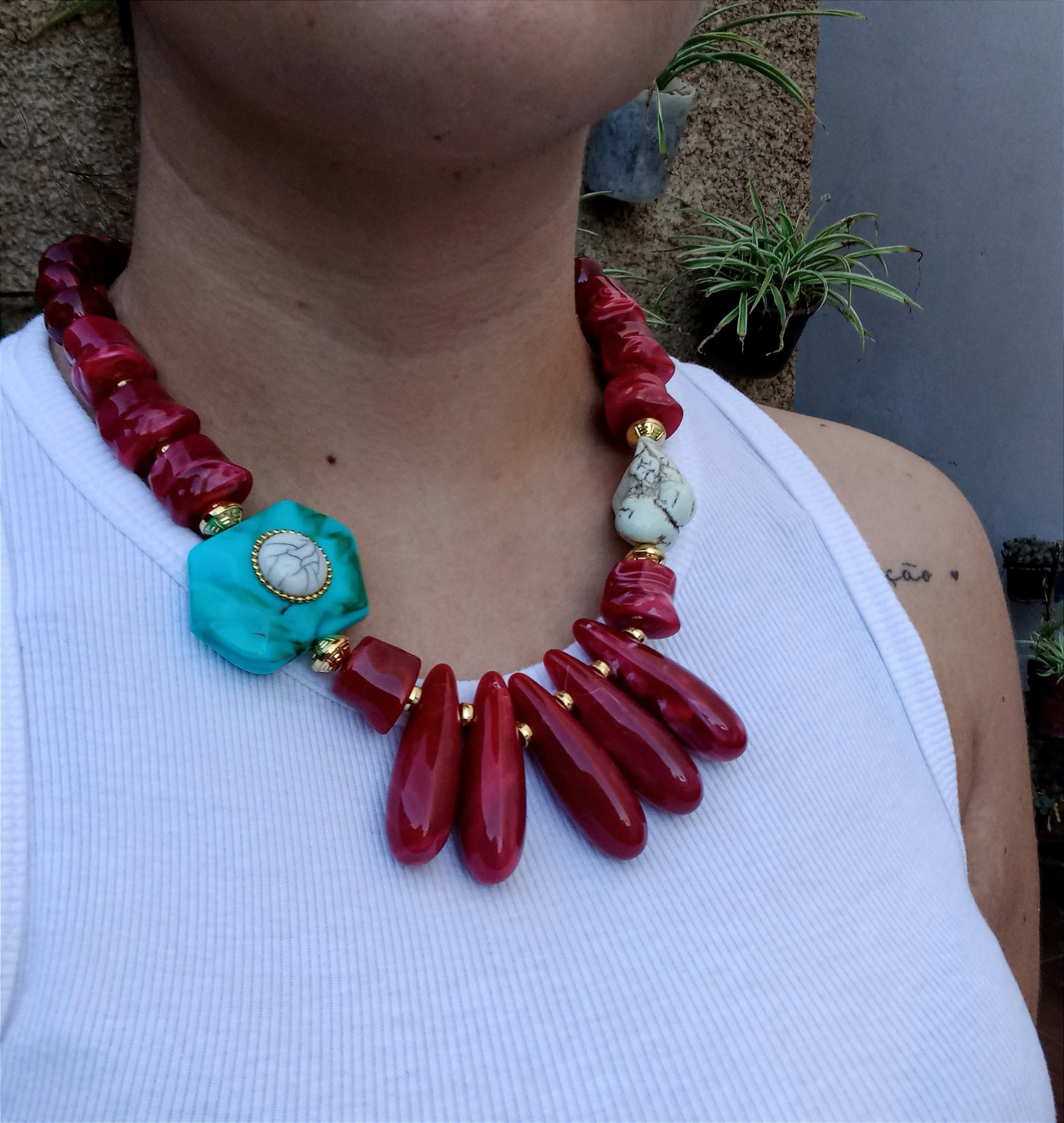 Maxi Colar Vinho Turquesa, um acessório em bijuteria com detalhes em dourado, resinas maravilhosas em