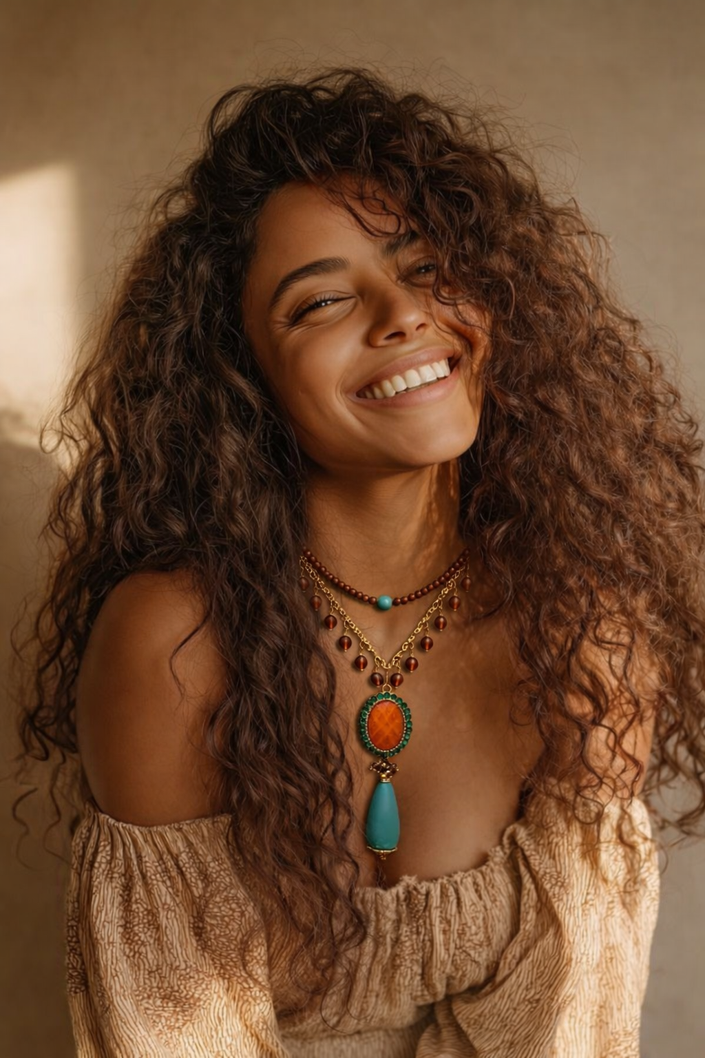 com detalhes em Howita turquesa, um pingente com esfera laranja e strass verde e uma gota maravilhosa