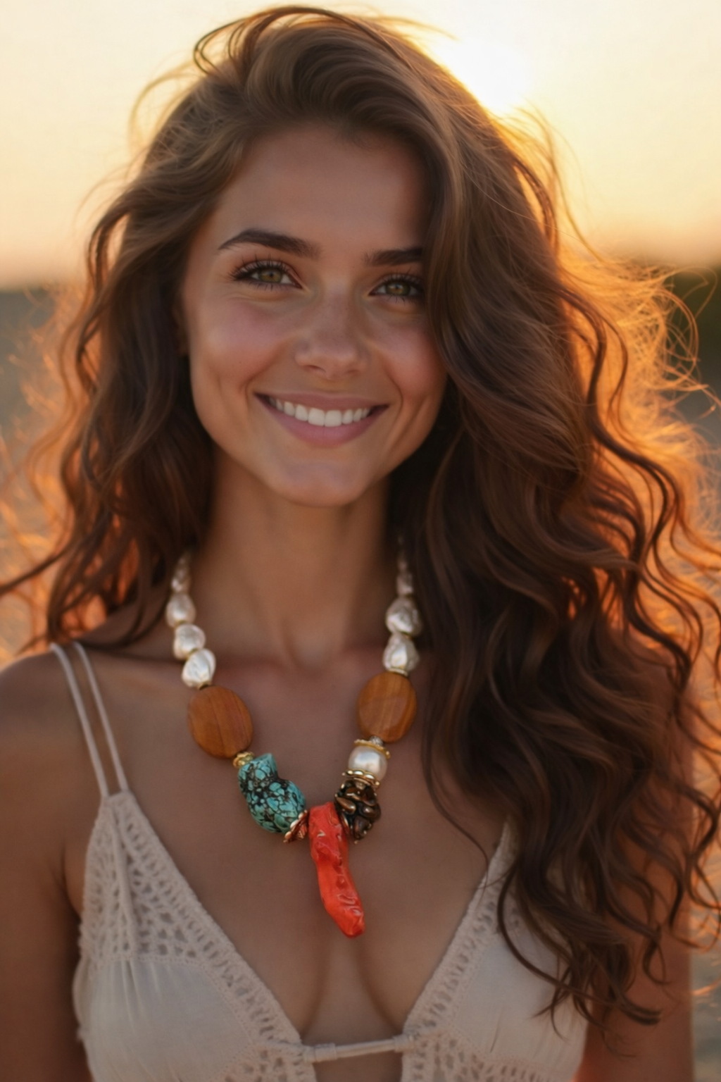 cascalhos de Olho de Tigre, cascalho grande em turquesa, esfera em pérola, entremeios de madeira e subindo