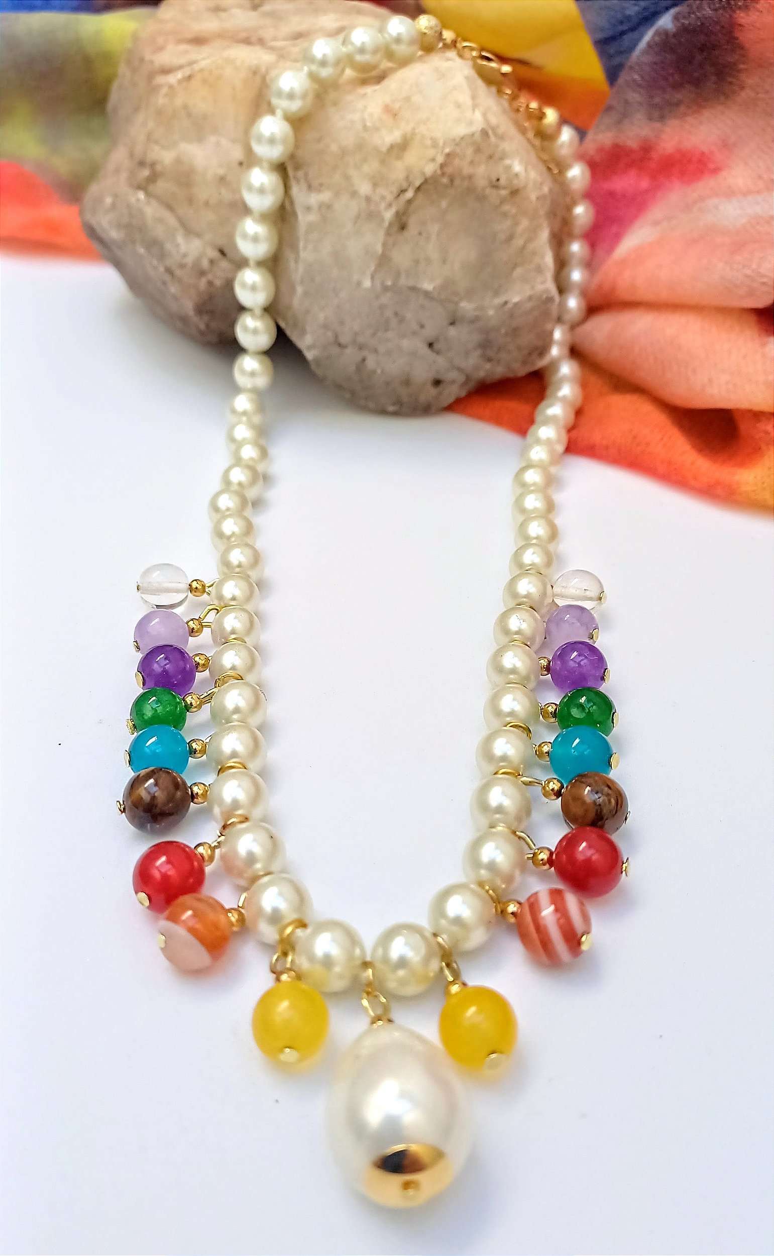 Colar Curto Pérolas e Ágatas Coloridas, uma bijouteria dourada, clássica e moderna, com gota Shell,